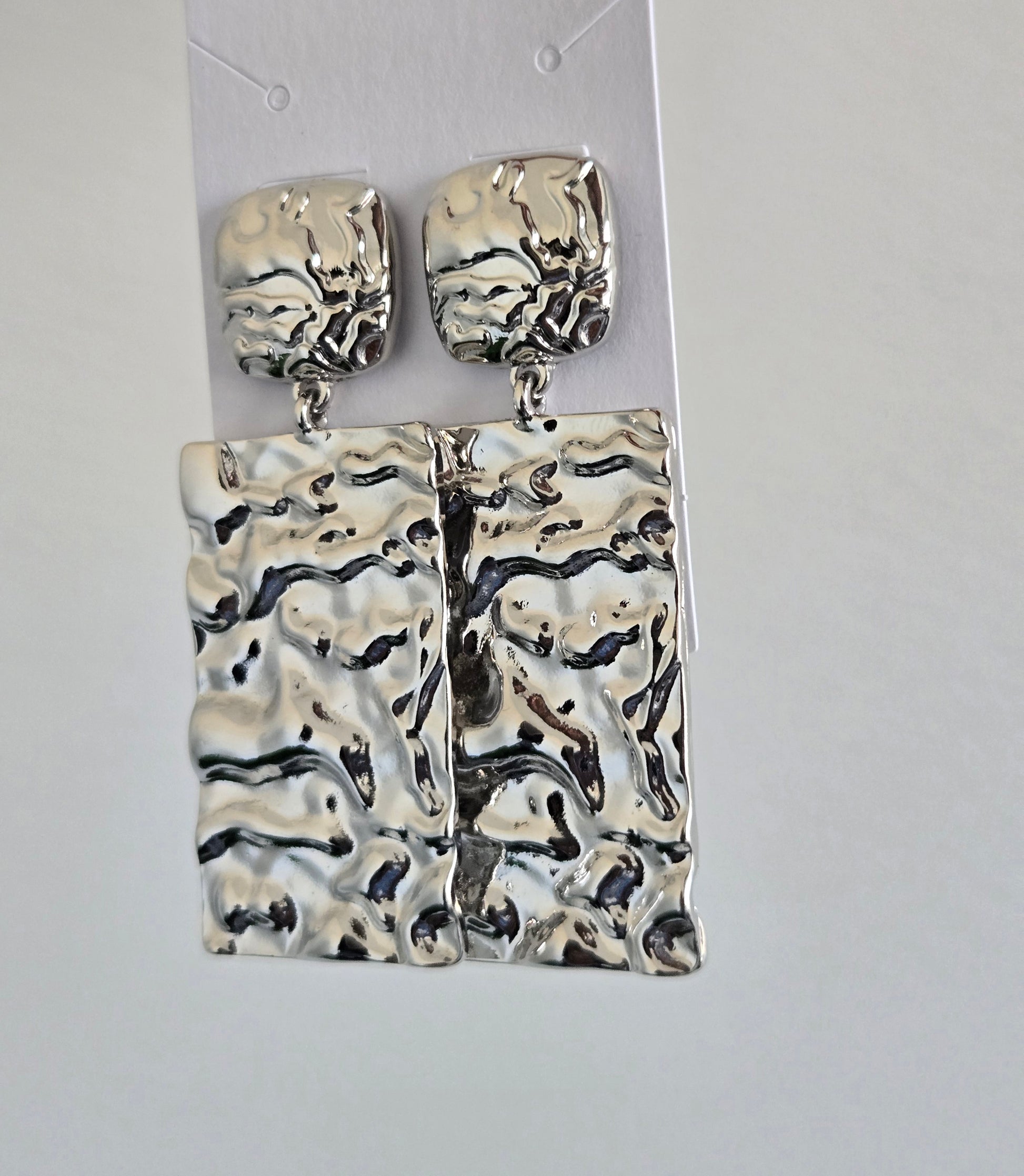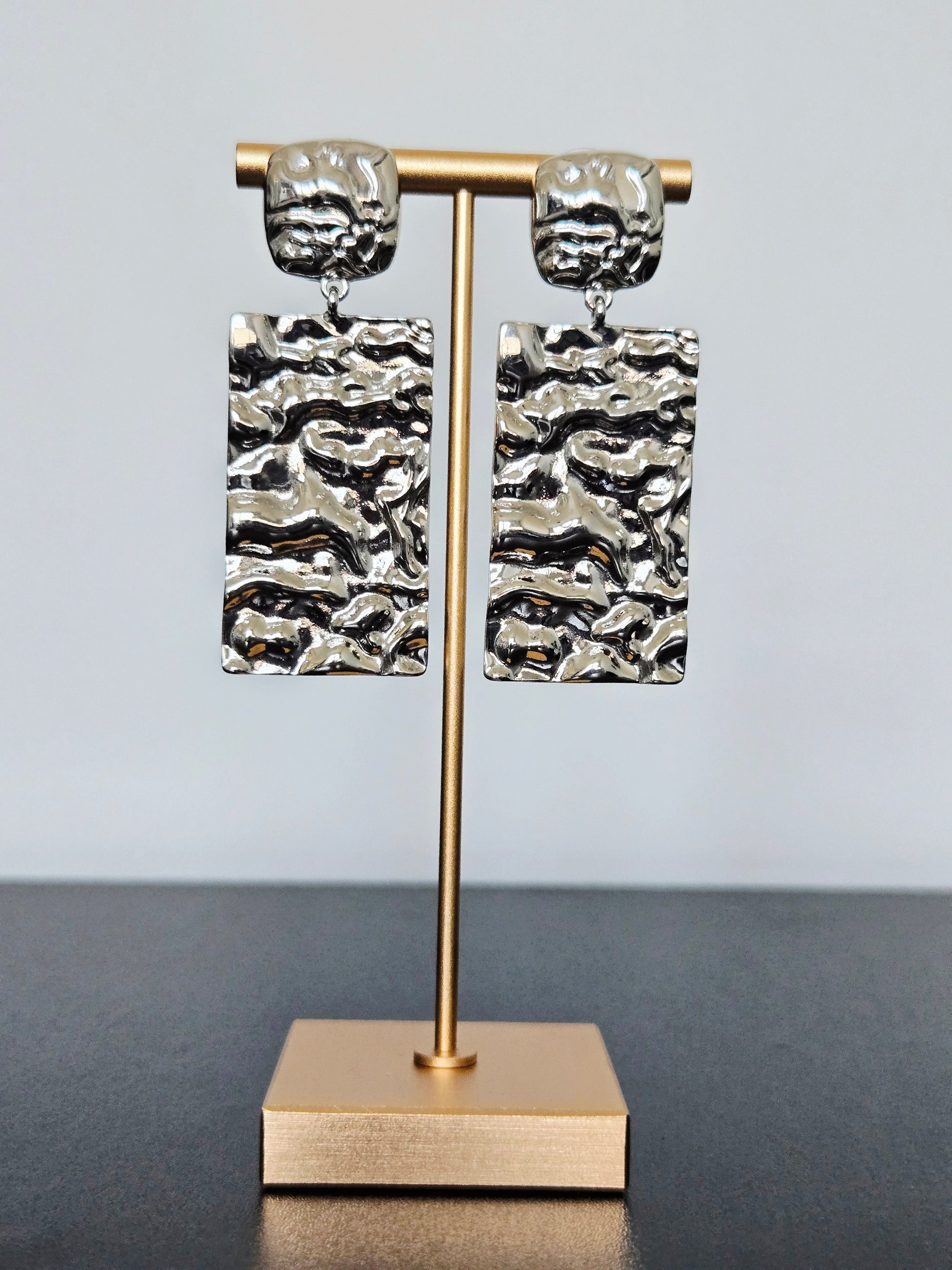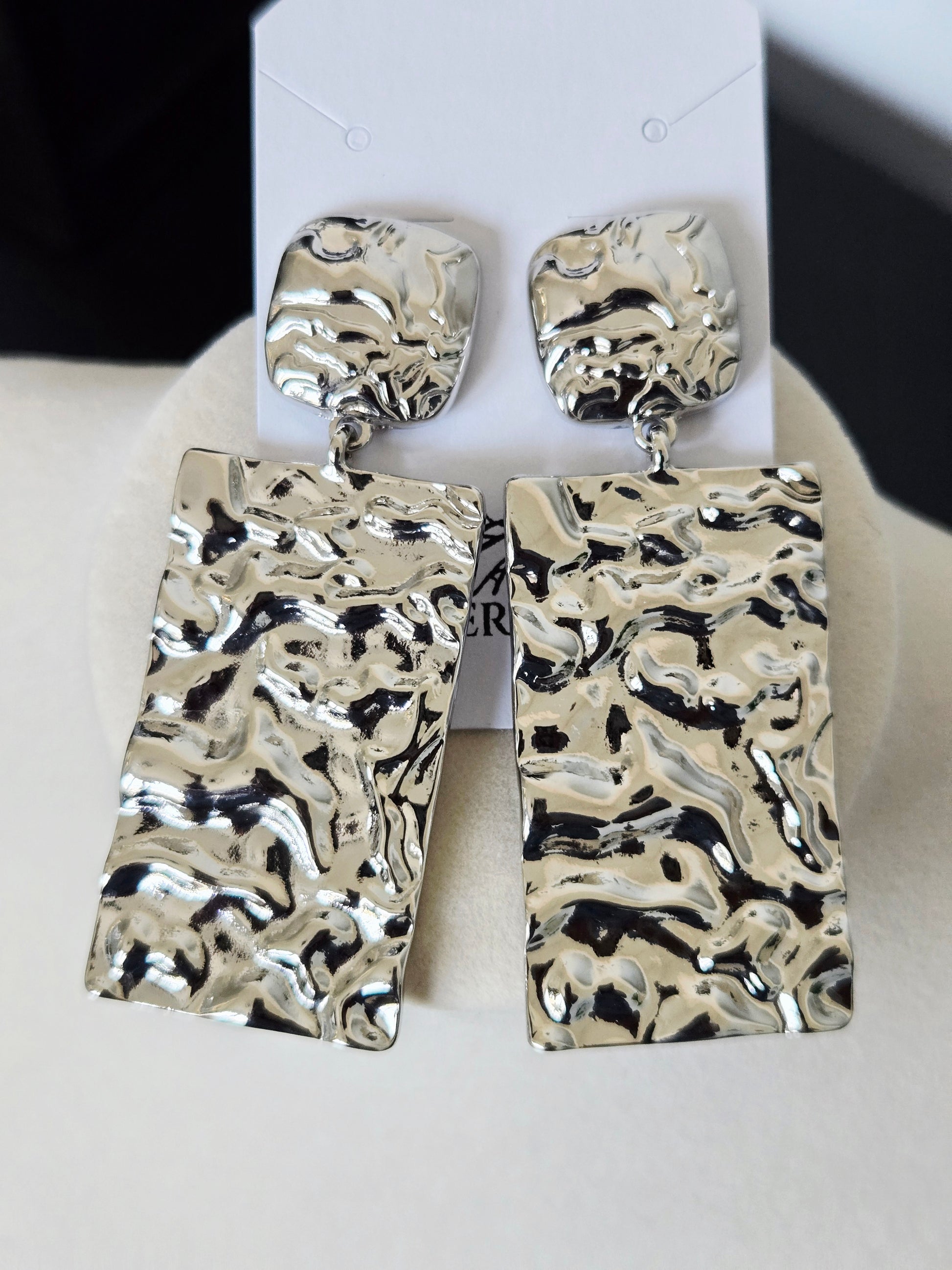 Bold and artful, the Carmen Earrings are designed to make a statement. Featuring a sculptural, hammered texture with a high-shine silver finish, these drop earrings reflect light in all the right ways. Their modern yet timeless design brings effortless drama to both casual and dressy looks.