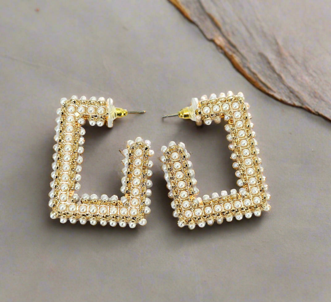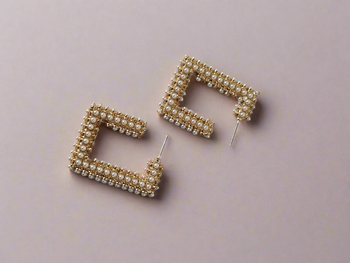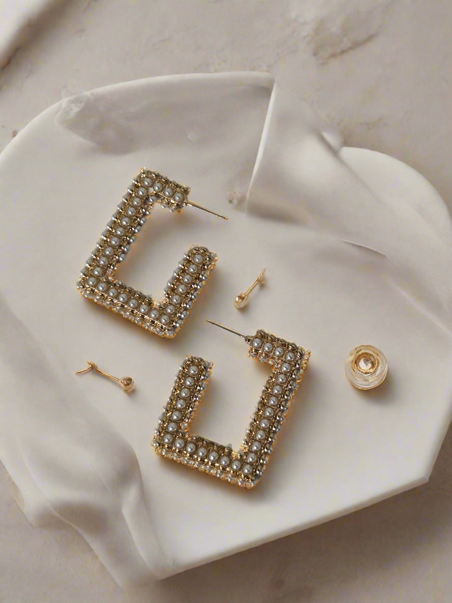 The Elora earrings bring modern structure to a timeless classic. Designed in a sleek rectangular silhouette and framed with delicate faux pearls, these statement earrings add a fresh twist to feminine style. Perfect for elevating a simple blouse or complementing a special occasion look, Elora is your go-to for instant sophistication with a hint of drama.