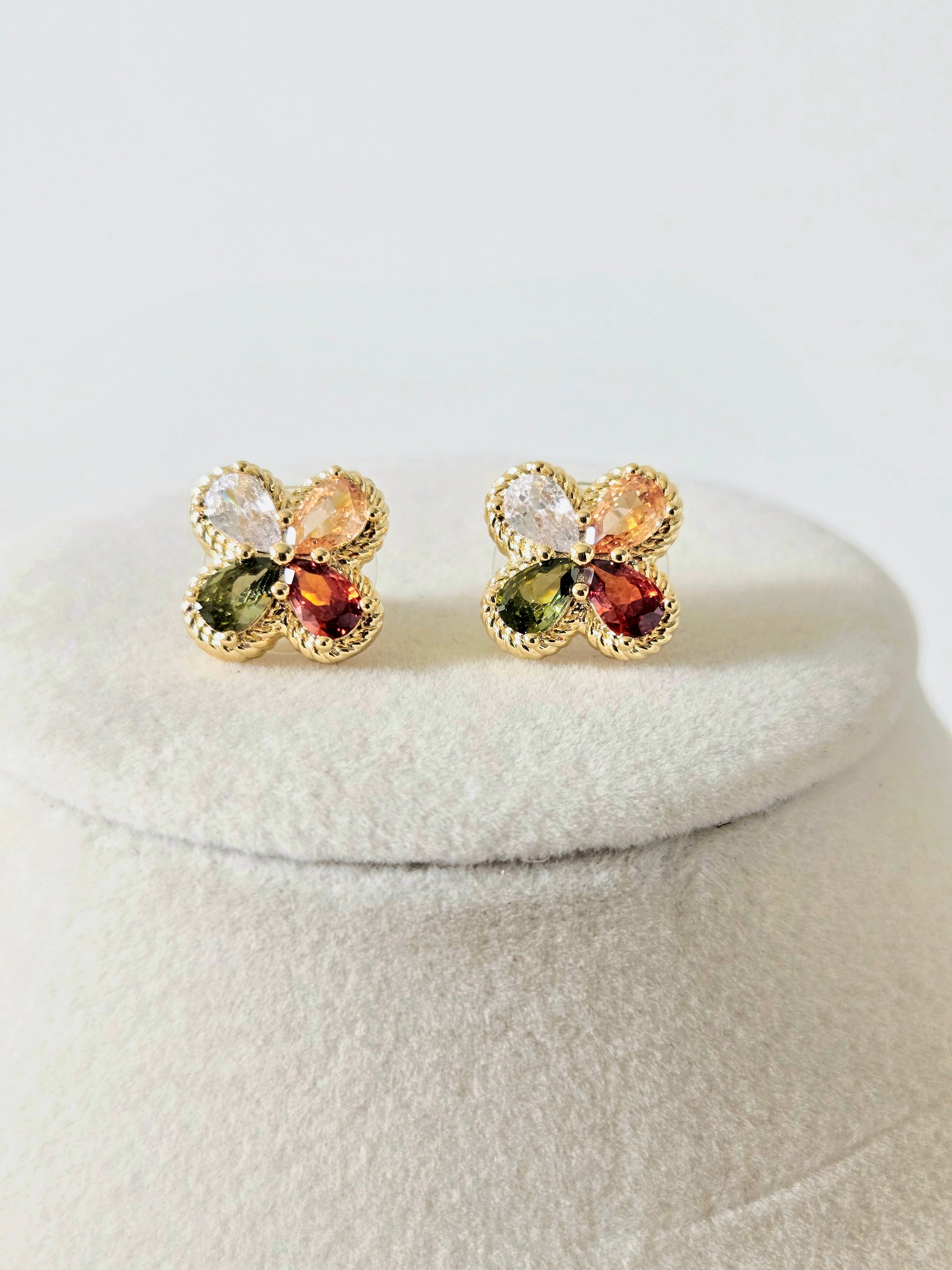 The Flora Earrings are a subtle statement with timeless charm. Featuring a floral-inspired design with soft multicolor stone accents, these studs add just the right amount of sparkle and femininity. Perfect for everyday wear while still feeling polished and special.