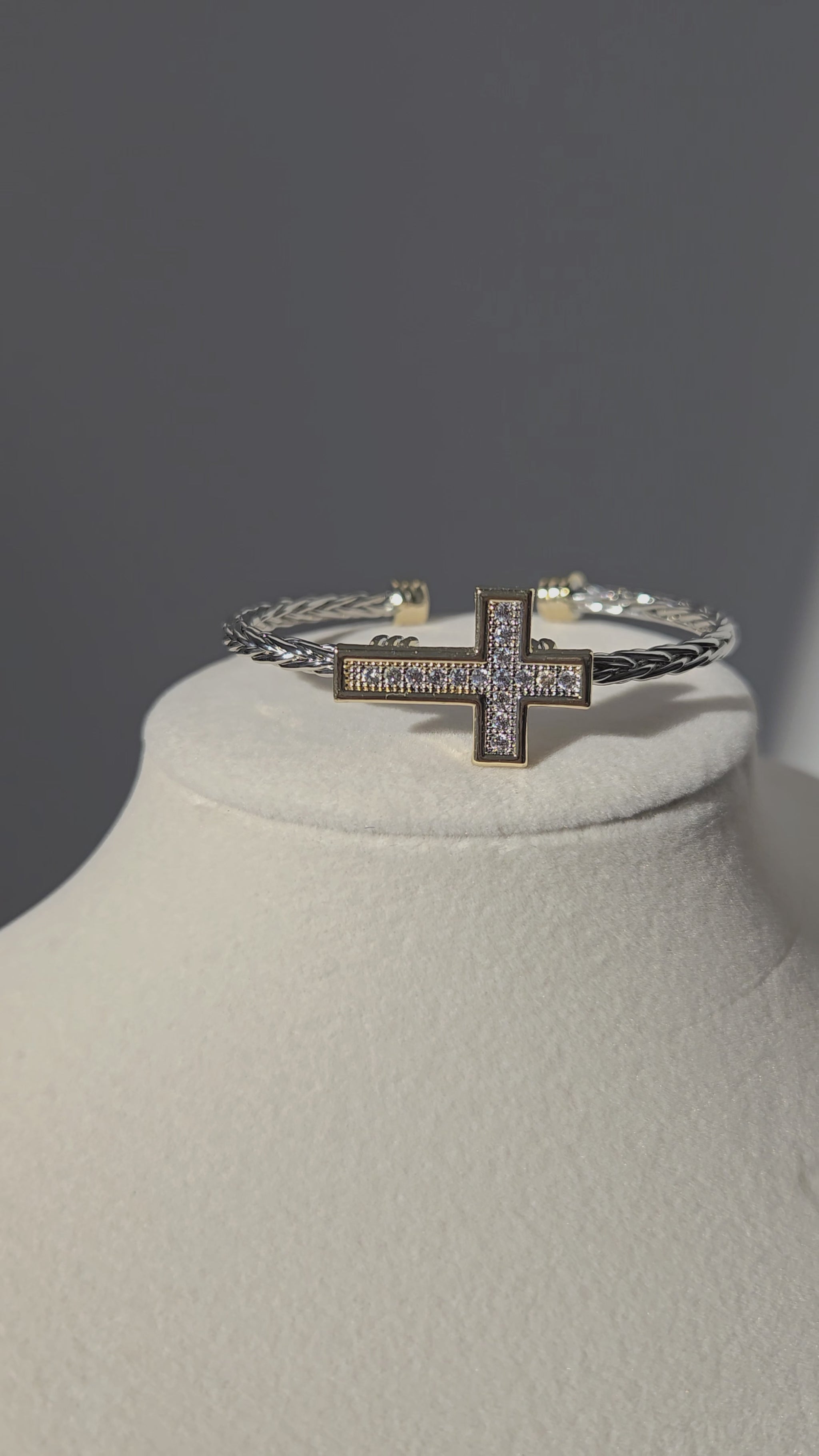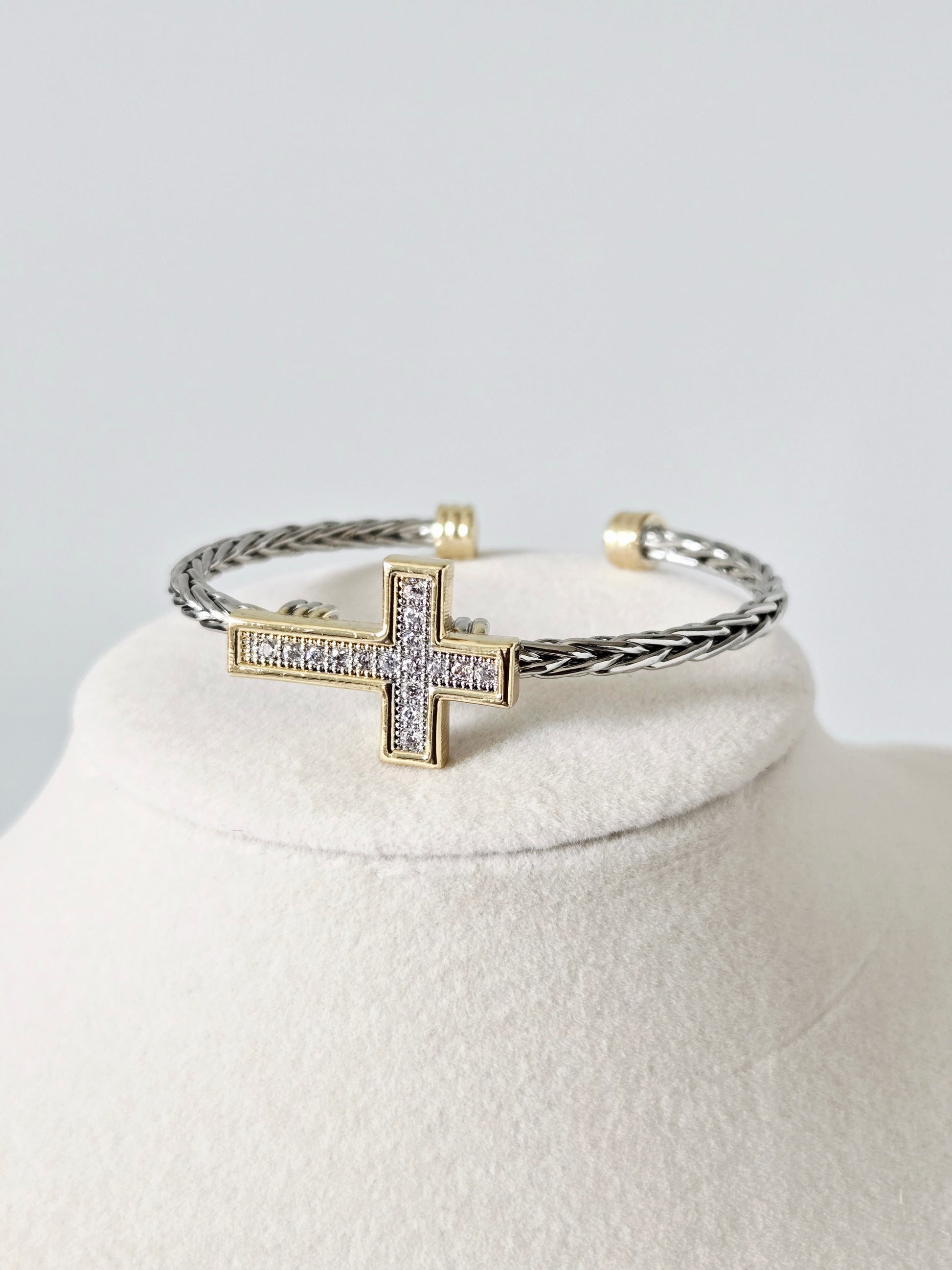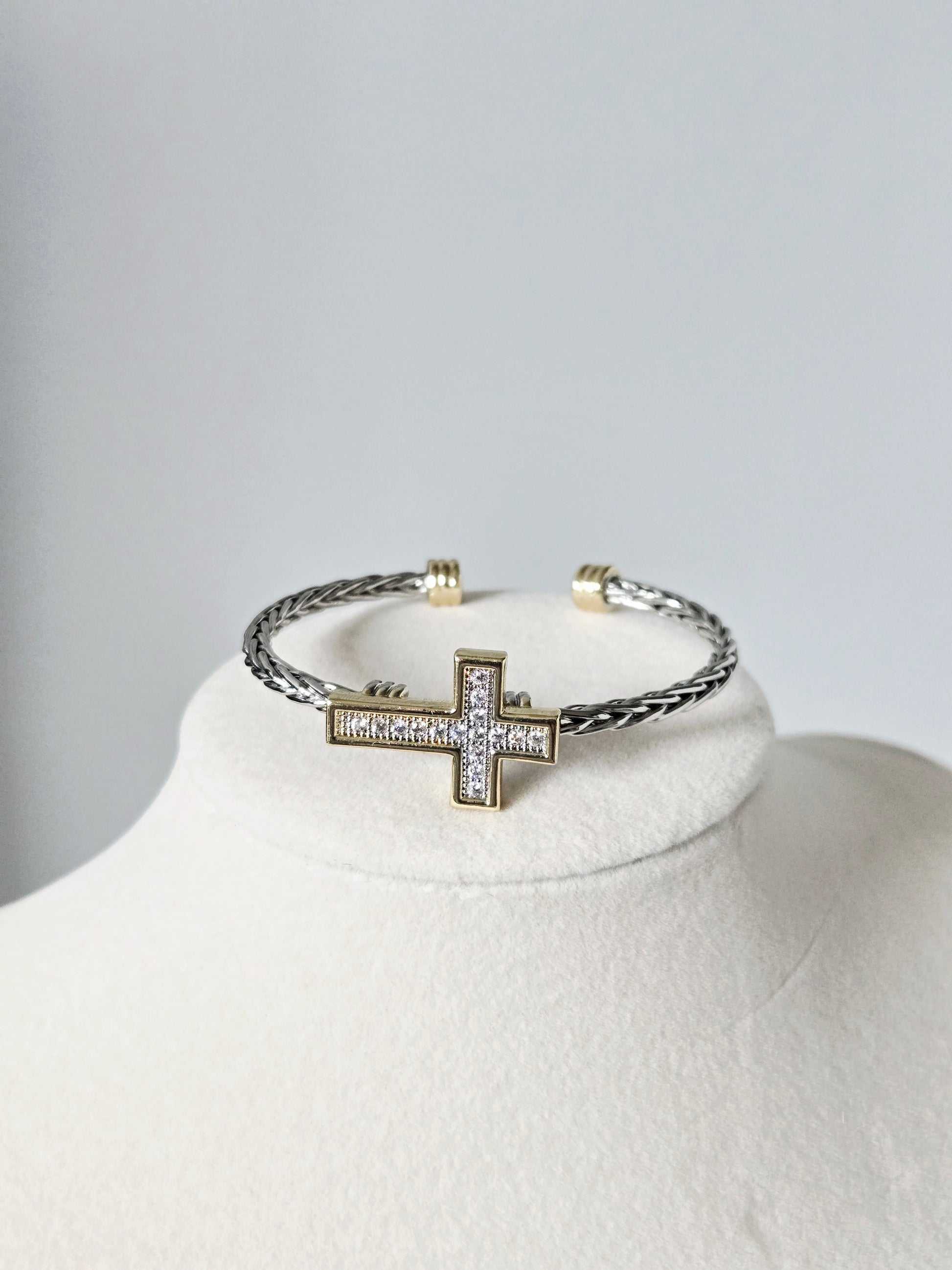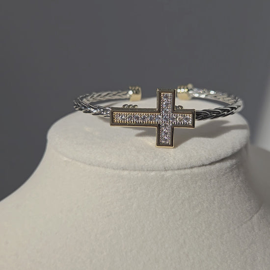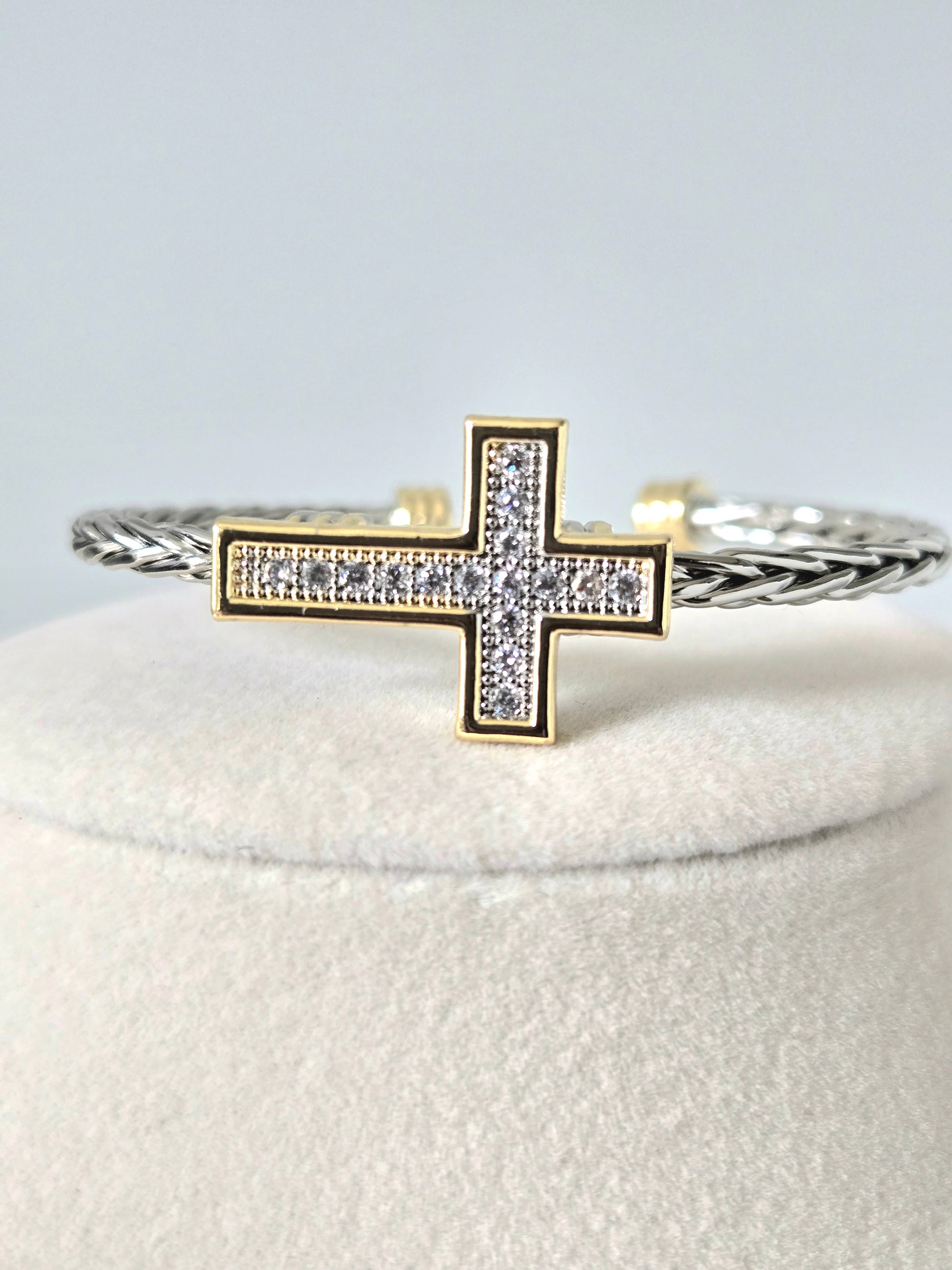 A radiant reminder to stay uplifted, the Hope Bracelet blends modern elegance with meaningful design. Its gold-framed pavé cross sits beautifully atop a two-tone braided band, creating a piece that’s both eye-catching and symbolic. Perfect for adding a touch of shine and inspiration to your everyday look.