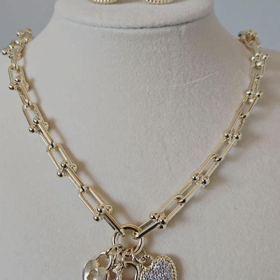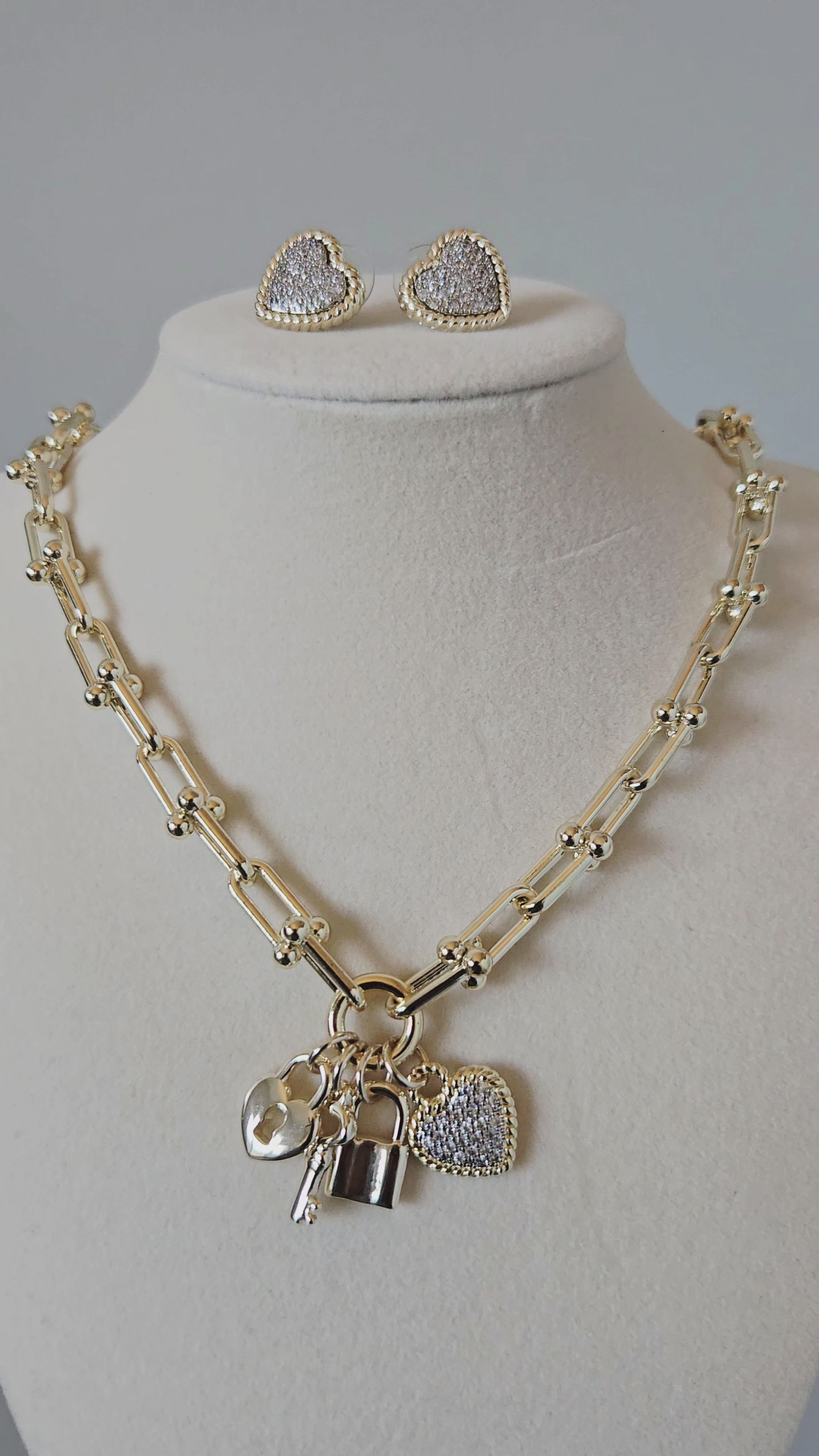 - Includes charm necklace and matching heart stud earrings