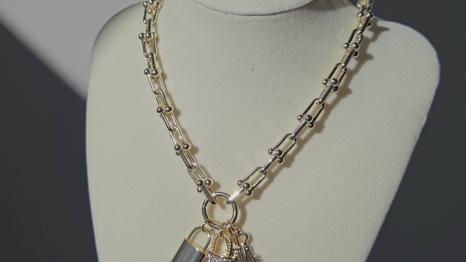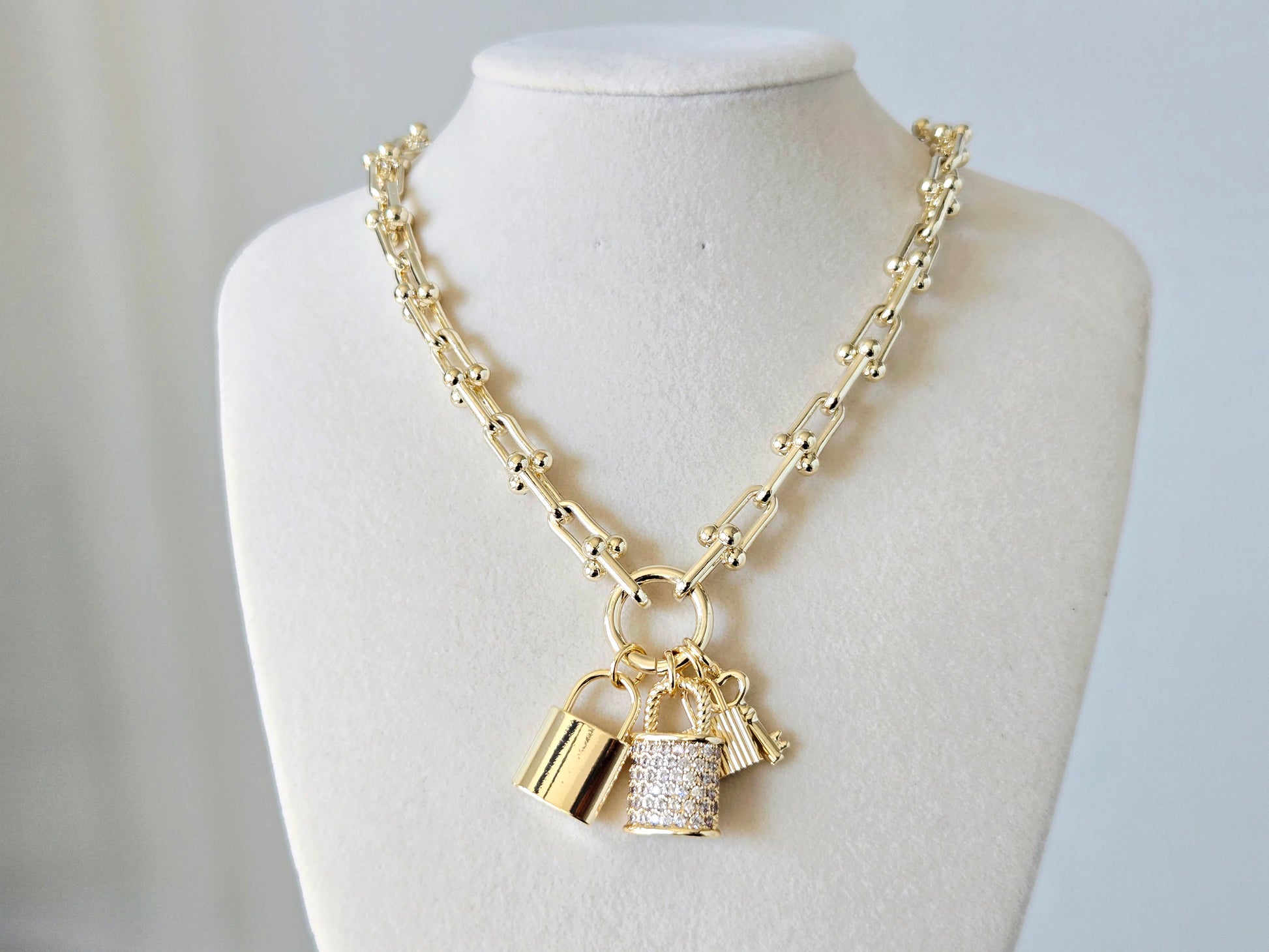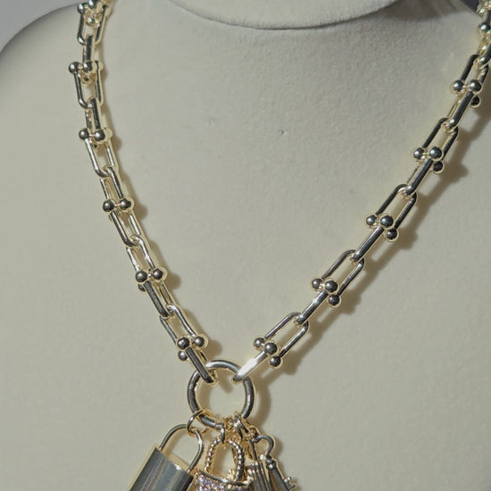 Meet Locked In — the necklace that makes a statement without saying a word. Designed with a bold linked chain and finished with three luxe charms (a sleek padlock, a pavé crystal lock, and a matching key), this piece blends edge and elegance in the best way.