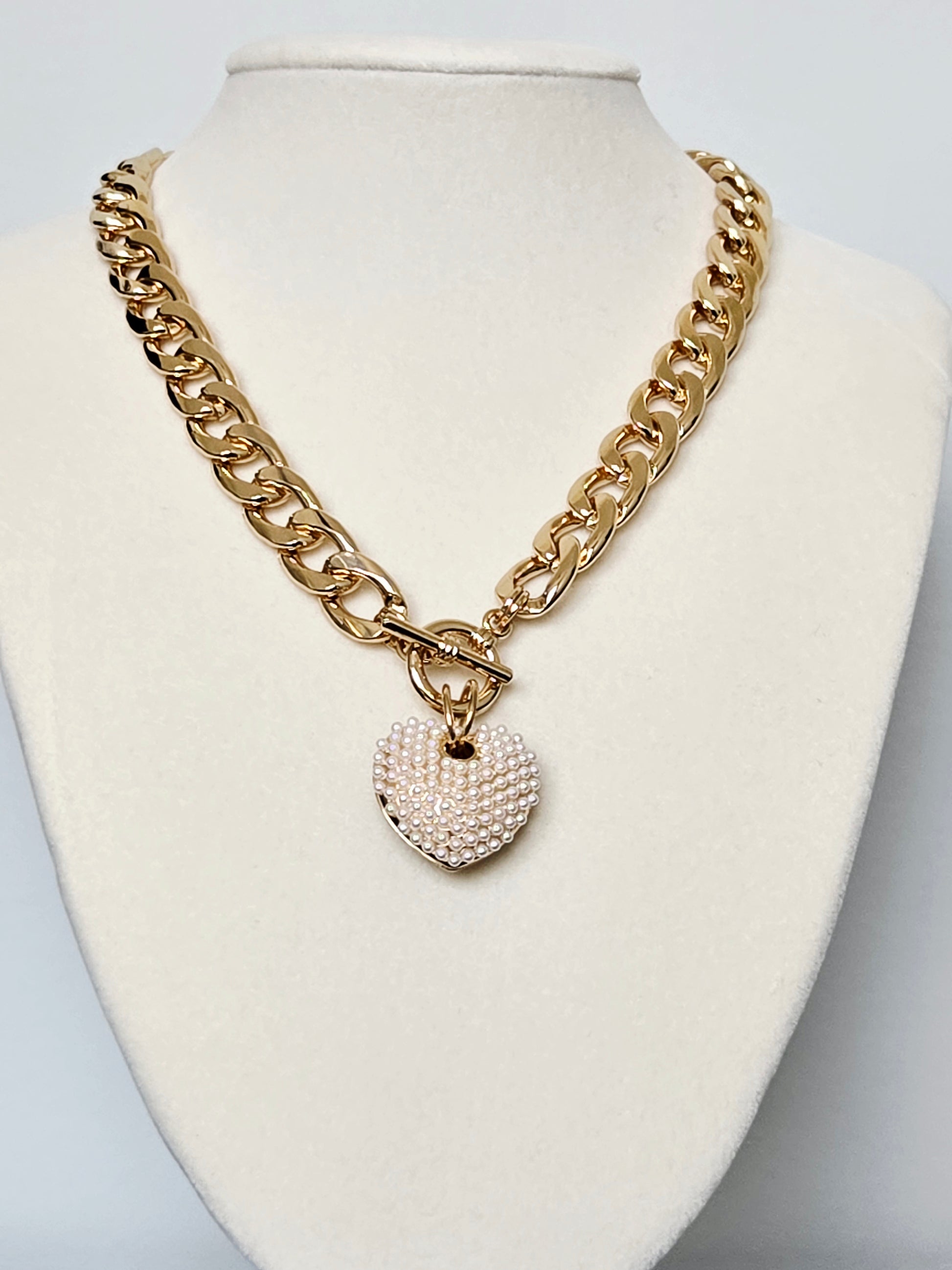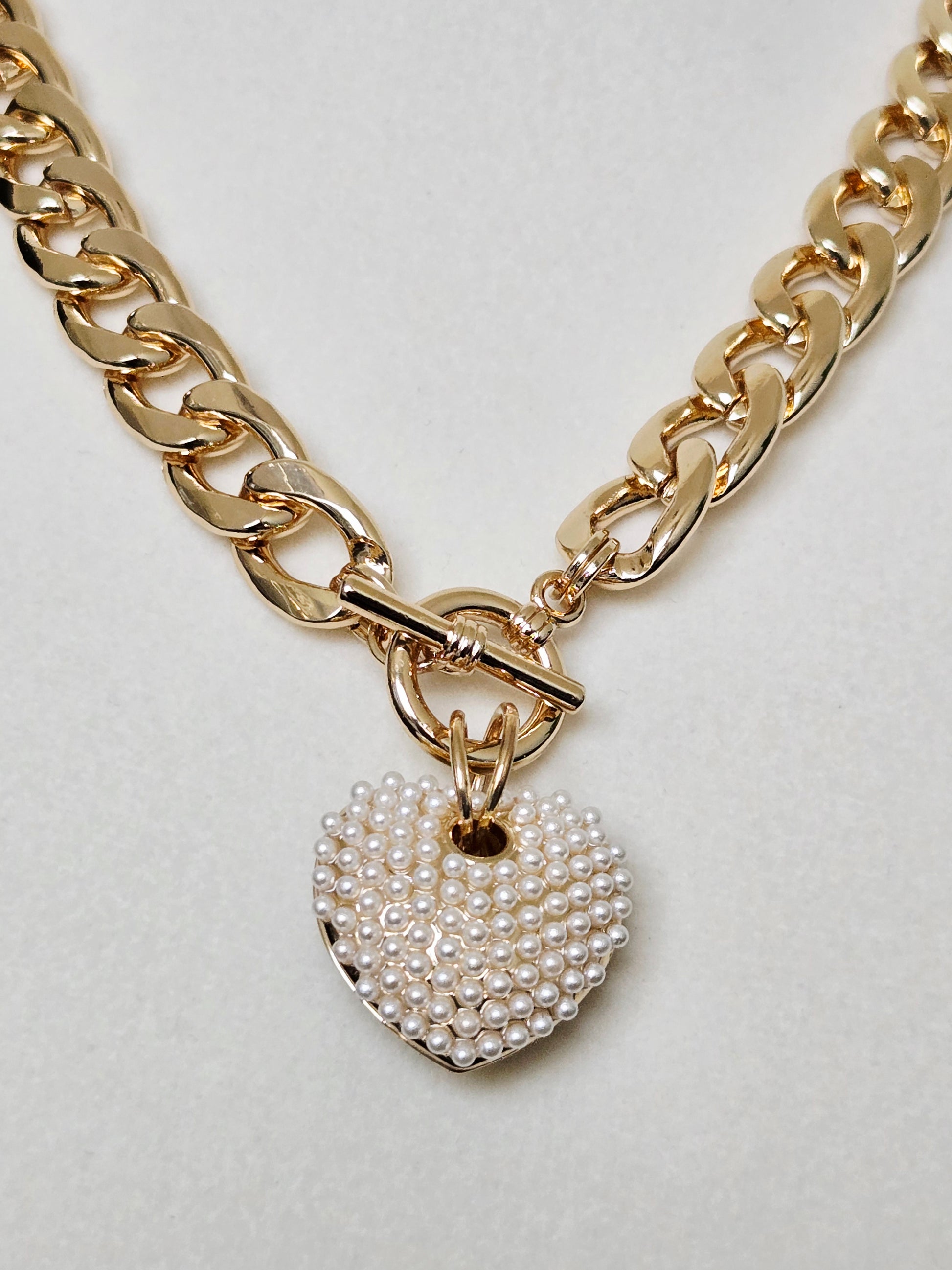 Turn heads with Monroe — a statement necklace that blends bold links with timeless romance. Featuring a chunky gold chain and a heart pendant detailed with delicate pearls, Monroe is the perfect piece for making everyday looks unforgettable.