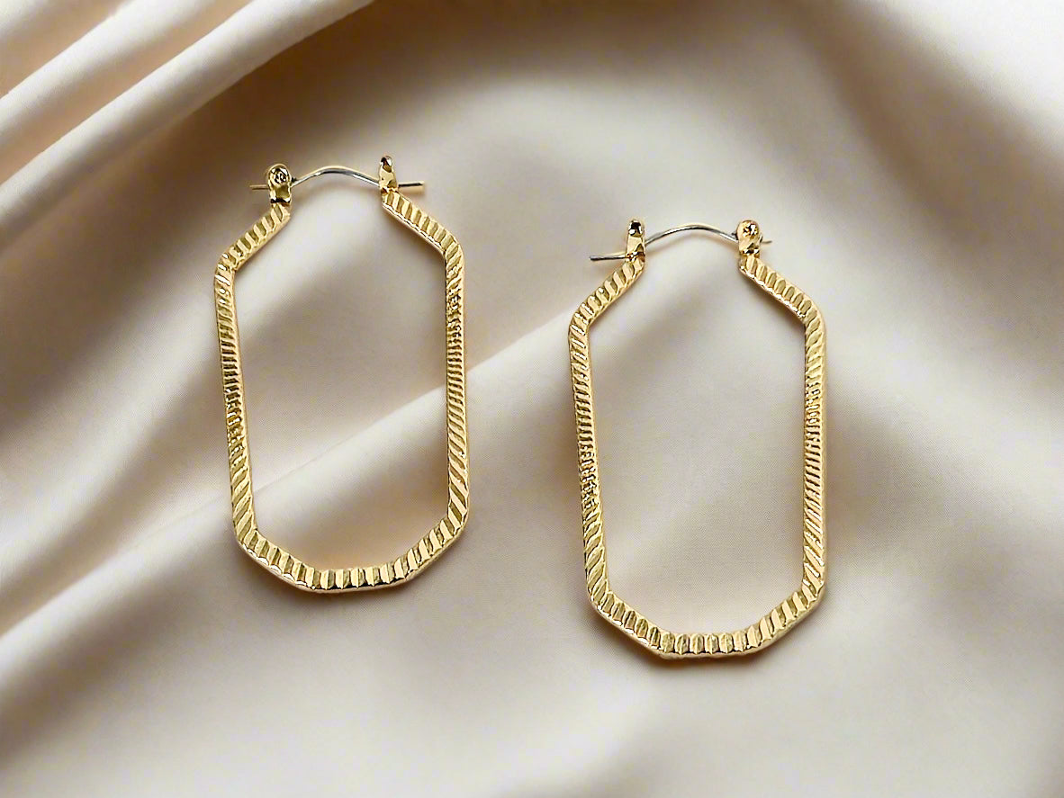 Make a sleek statement with the Nora earrings. Designed with a modern geometric silhouette and subtle textured edges, these lightweight hoops add just the right amount of shine to your look. Whether paired with your favorite tee or a sleek evening dress, Nora is the perfect blend of minimalism and style.