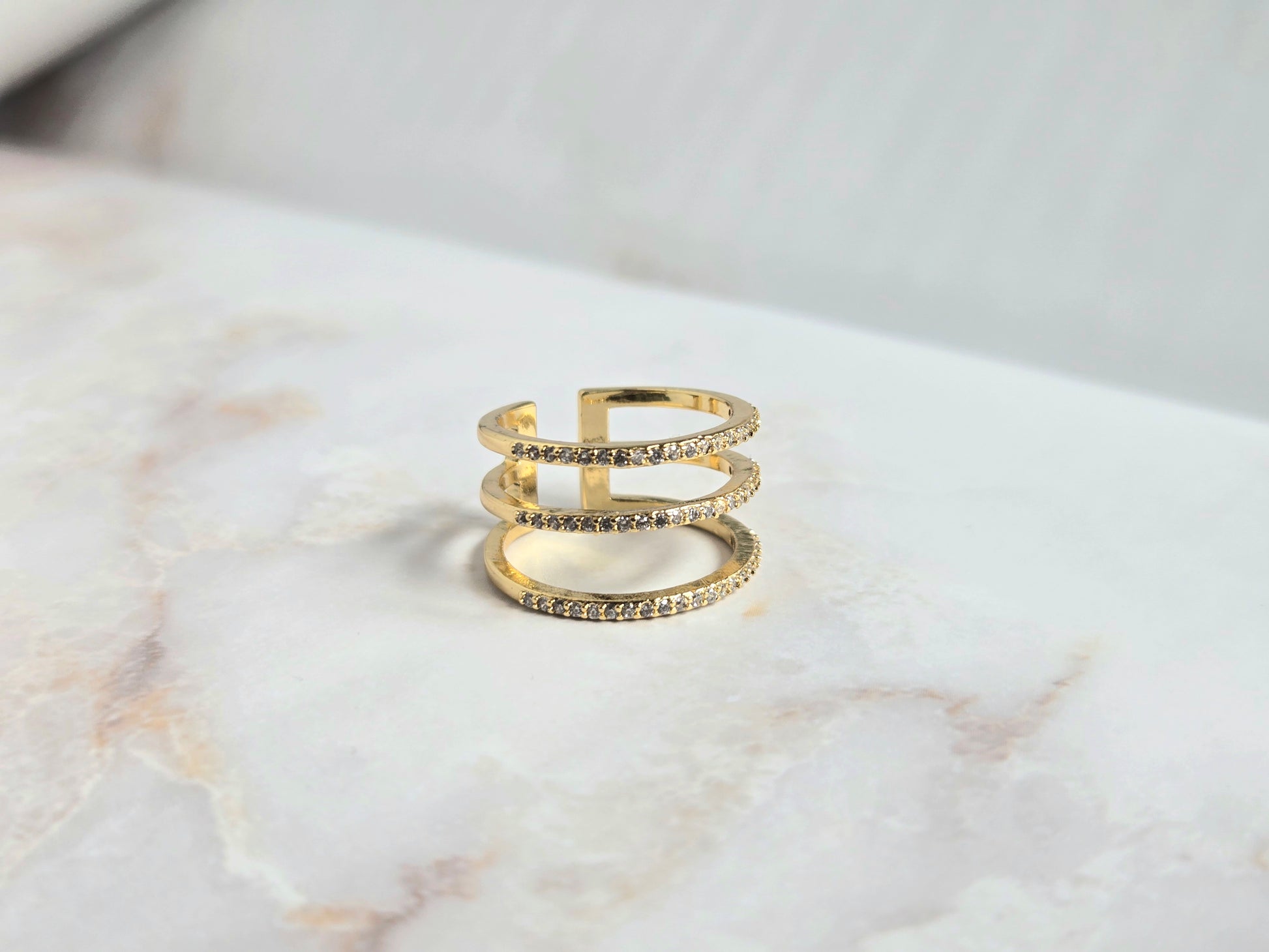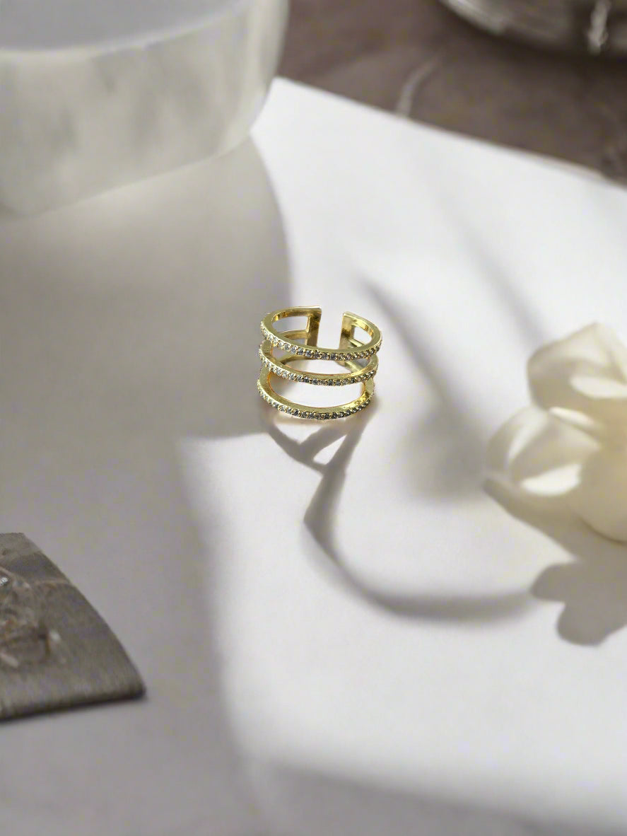 Shine like you were made to! The Nova Ring features a triple-band design with rows of delicate stones, creating the look of stacked elegance in a single bold gold ring. This adjustable statement piece offers an effortless way to elevate your everyday jewelry collection. Wear it solo for a sleek finish or pair it with dainty rings for a layered moment.
