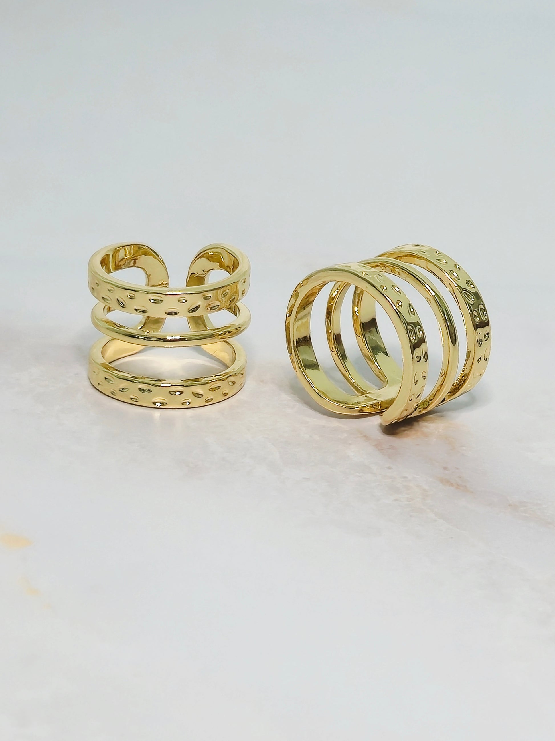 Bring golden hour to your fingertips with the Raya Ring — a radiant, gold adjustable ring designed to shine from every angle. With its bold, open band silhouette and subtle hammered texture, this piece captures the light beautifully while adding effortless style to your everyday look.