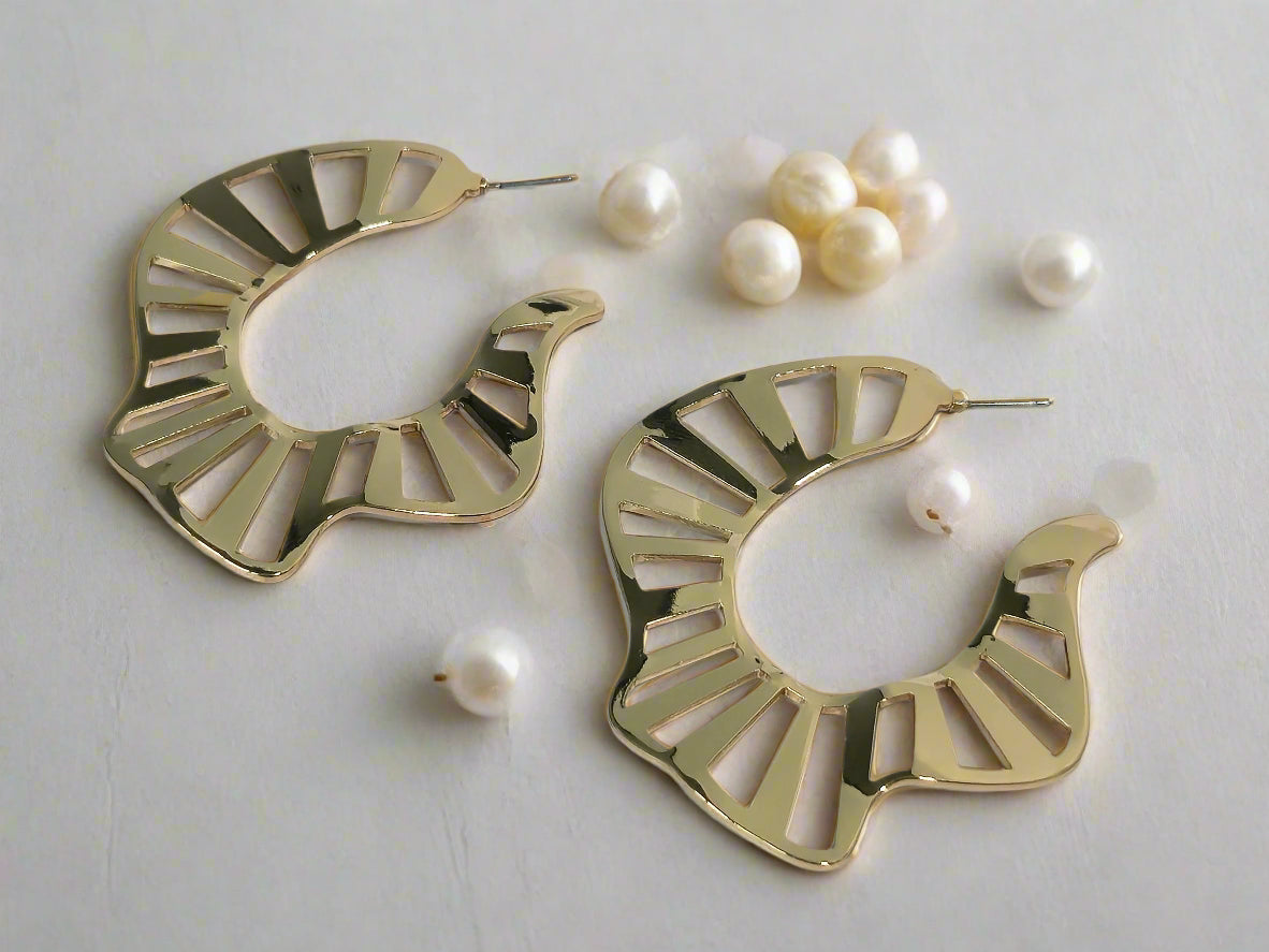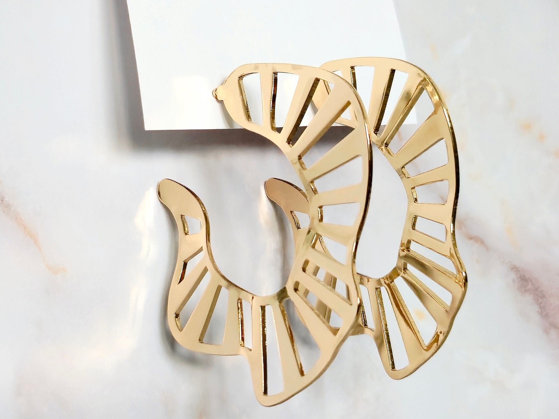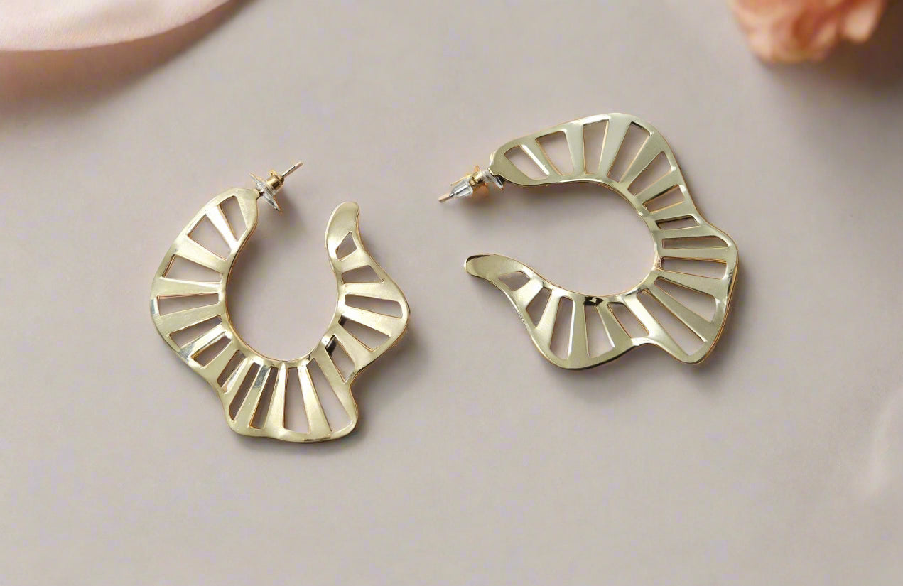 Make a statement with the Solara earrings — a bold, sculptural design inspired by rays of sunlight. The open-cut structure and flowing curves create a striking silhouette that catches the light beautifully with every turn of your head. Perfect for elevating a casual look or adding drama to an evening outfit.