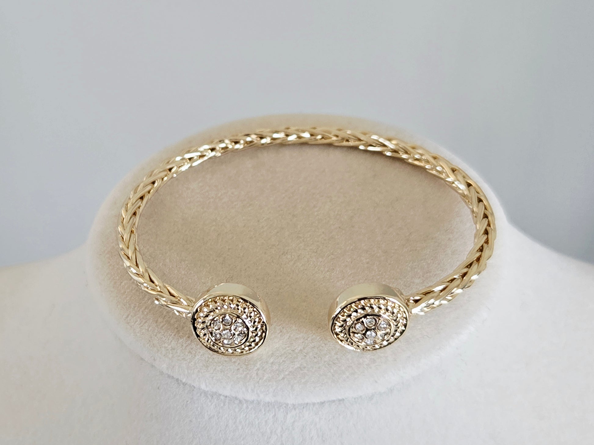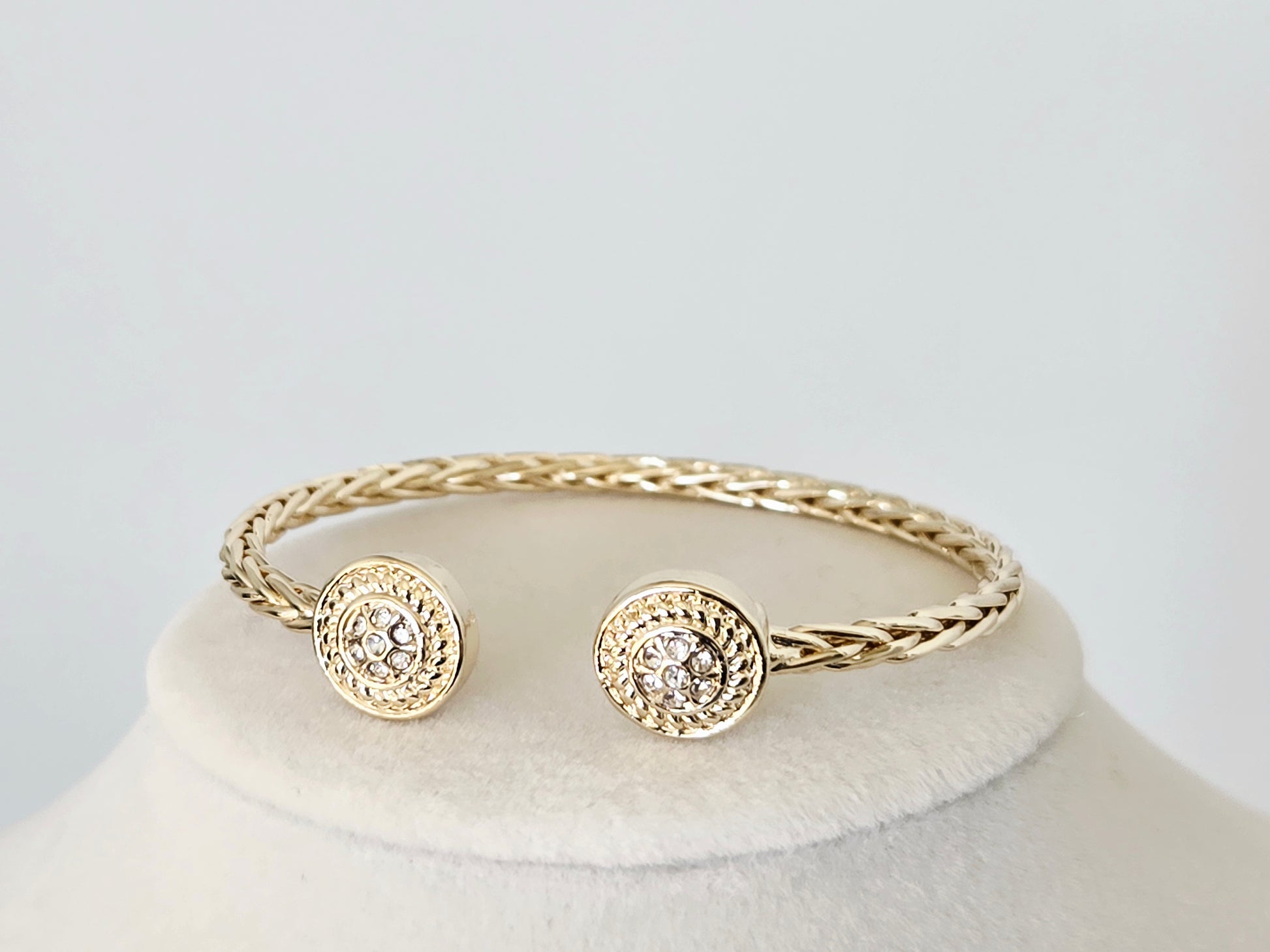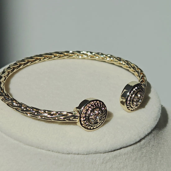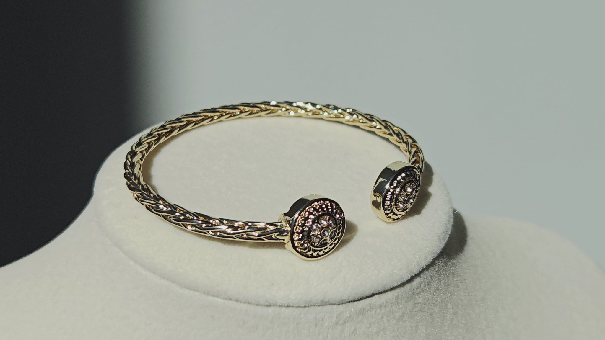 Haven is a refined cuff bracelet that blends soft shimmer with bold detail. Featuring a woven gold band and crystal-accented ends, this piece adds polish to your everyday while holding its own in any stack.